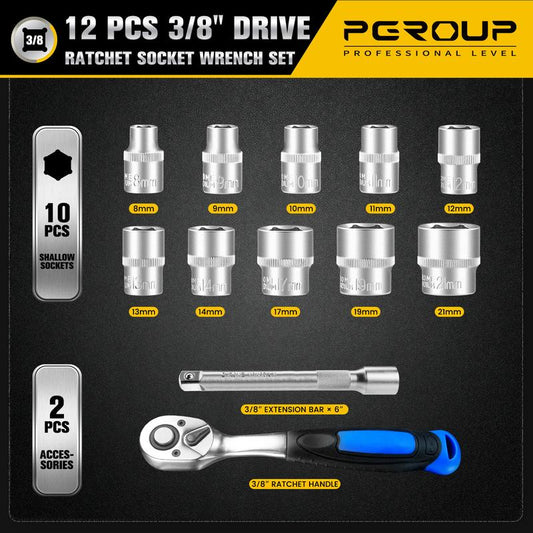 12PCS 3/8" Drive Metric Socket Ratchet Wrench Set , 90-Tooth Reversible Ratchet Handle,6 Point Shallow (8-21Mm) and Extension Bar 6", CR-V Steel